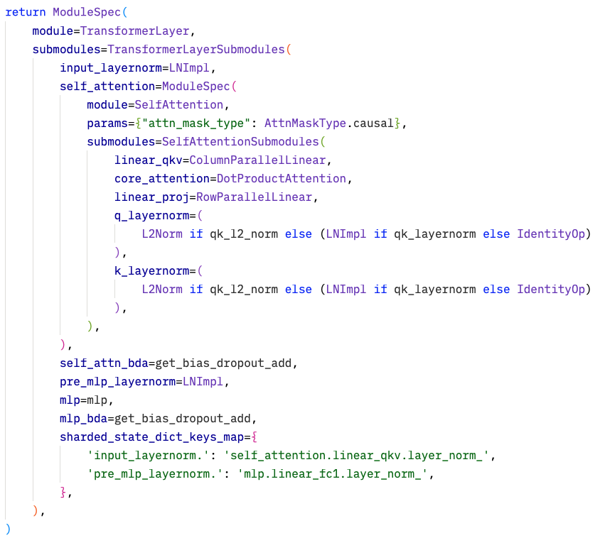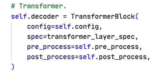 这里可以通过传入自定义的Spec来定制你想要的模型结构。默认情况下就是最常见的transformer decoder结构。pre_process和post_process用于判断当前rank上的模型是不是pipeline开始或者结束的部分。