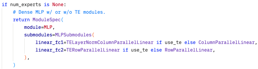 那么列并行结束了。行并行RowParallelLinear有用在哪里呢?可以看到GPT的MLP中包含两个linear_fc,第一个是列并行,第二个是行并行。在get get layer local spec中以及mlp的module spec,可以看到有一些RowParallelLinear出现。