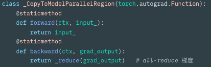 copy_to_tensor_model_parallel_region前向值返回输入,反向时会对梯度all reduce保障TP内GPU有相同输入梯度