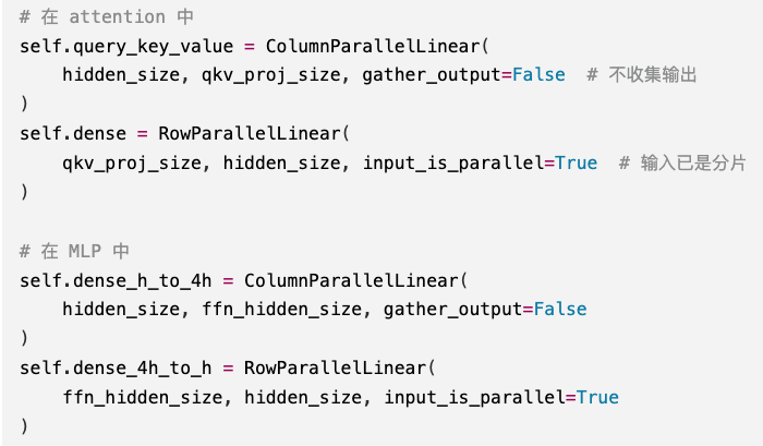 - Row:前向 all‑reduce + 反向 all‑gather(可选)。