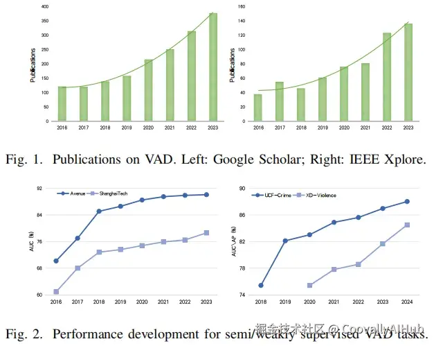 随着深度学习的兴起,VAD 进入了新的发展阶段。如图1所示,近十年来相关论文数量持续快速增长,尤其是在 IEEE Xplore 和 Google Scholar 中,VAD 相关研究呈现出爆发式增长。