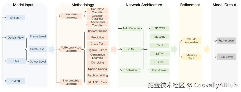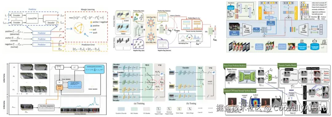 图10展示了六种典型的开放集监督 VAD 方法流程。