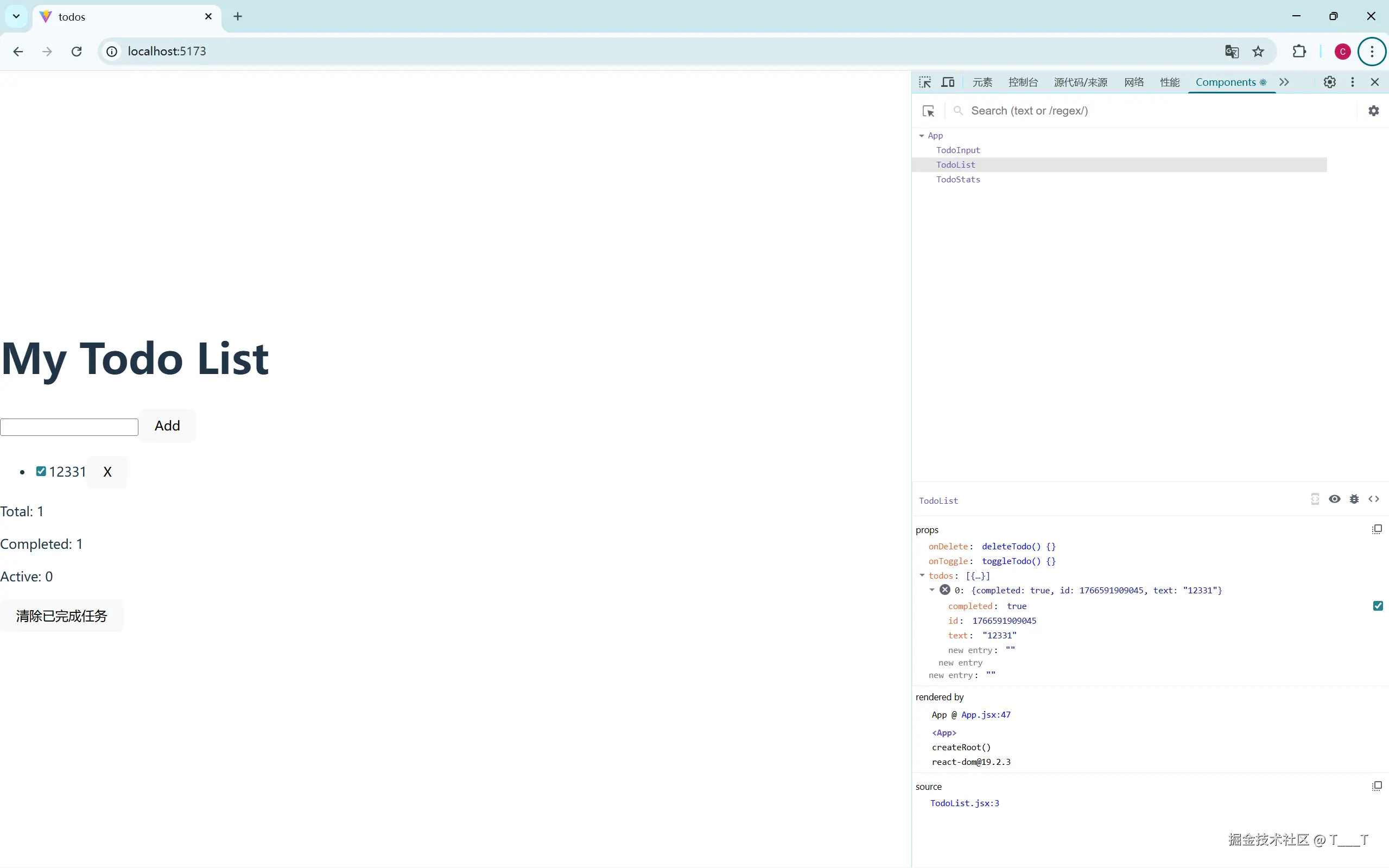 每个组件只做一件事:TodoInput 只处理输入,TodoList 只渲染列表,TodoStats 只展示统计。这种拆分让组件 "高内聚、低耦合":