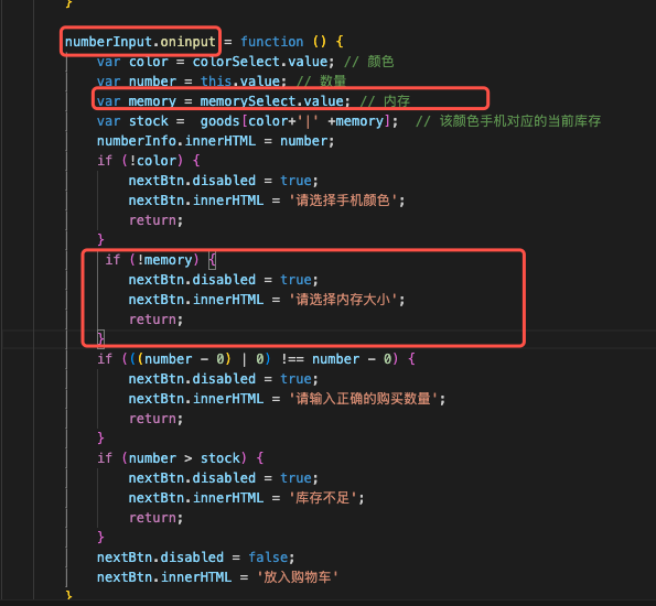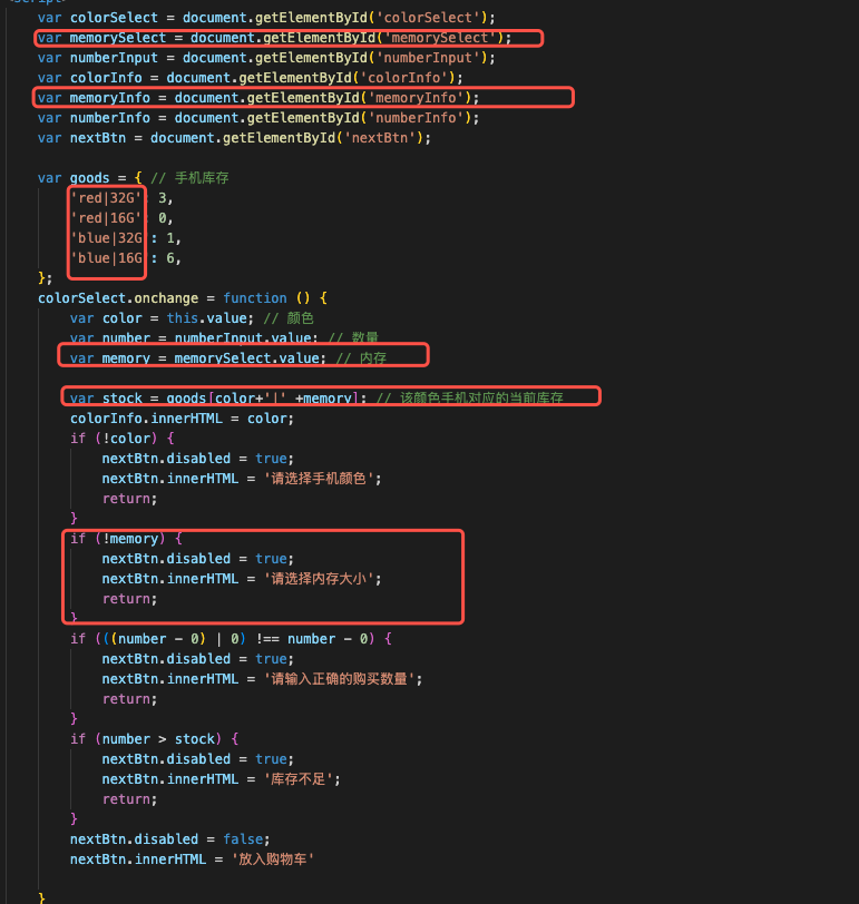 var stock = goods[color+'|' +memory]; // 该颜色手机对应的当前库存