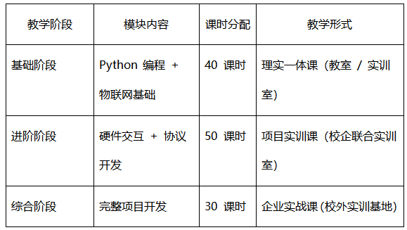 通过构建 "能力导向、项目贯穿、校企协同" 的教学体系,本方案致力于培养既具备扎实 Python 编程基础,又精通物联网设备开发与系统集成的复合型人才,为职业院校物联网专业课程改革提供可参考的实施范式。