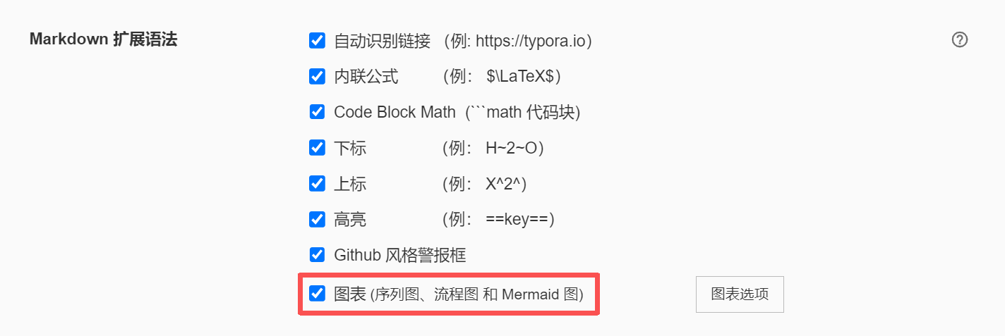 这里的Typora是1.9.5版本,在画甘特图前,需要保证"文件→偏好设置→Markdown→Markdown扩展语法→图表(序列图、流程图和Mermaid图)"已经被勾选,如下图所示: