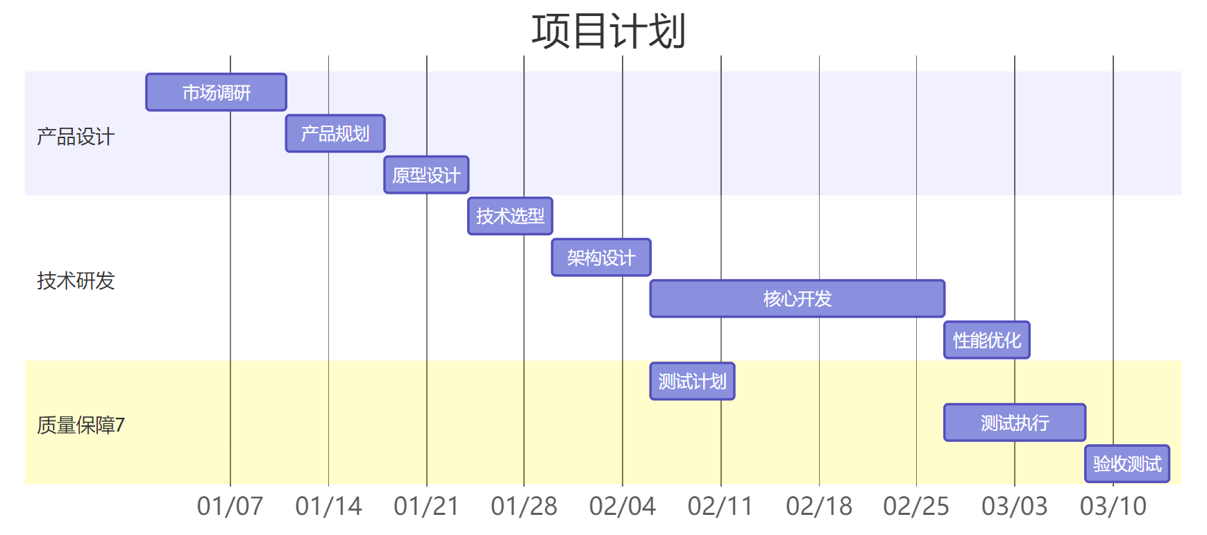 01/07 01/14 01/21 01/28 02/04 02/11 02/18 02/25 03/03 03/10 市场调研 产品规划 原型设计 技术选型 架构设计 核心开发 测试计划 性能优化 测试执行 验收测试 产品设计 技术研发 质量保障 项目计划