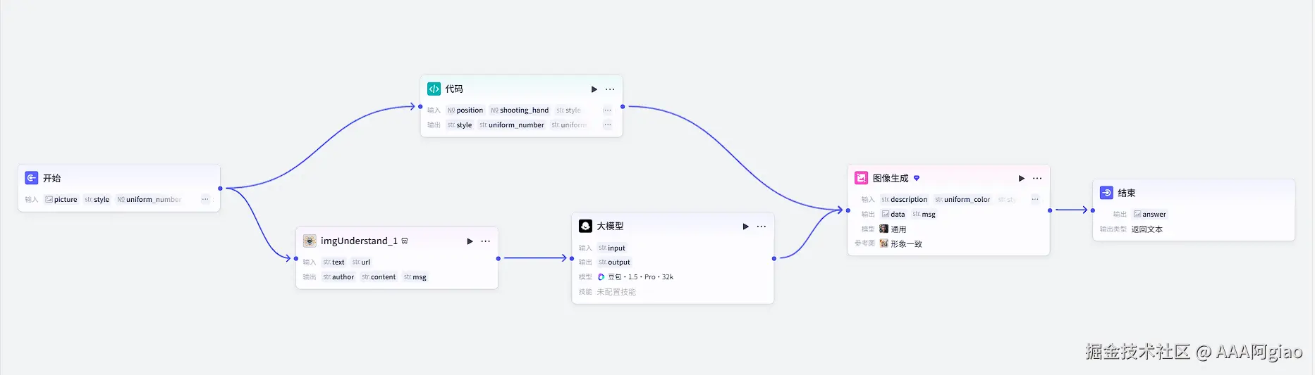 - 图像生成节点:调用文生图模型(如豆包·1.5·Pro·32k),生成新图像。
