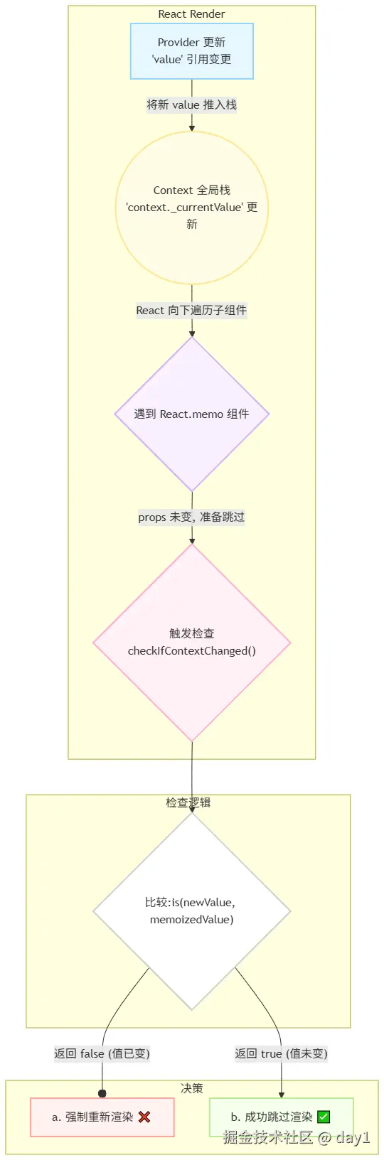 要理解 Context 的工作原理,我们必须将其视为一个被动的、在"跳过更新"时进行检查的"拉取式"订阅系统,而非主动的"发布-订阅"模型。