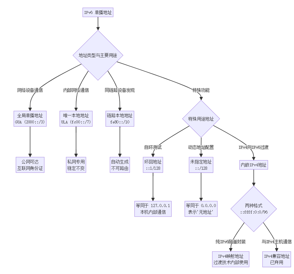 | 地址类型 | 前缀/地址 | 关键特点 | 类比 IPv4 | 主要用途 |