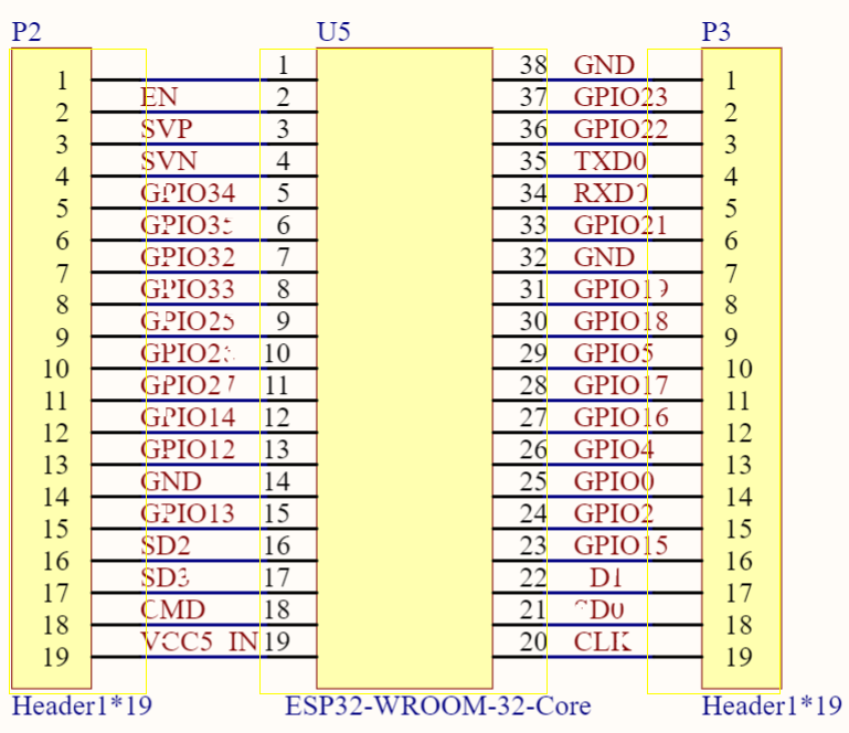 我们看到ESP32的23PIN就是GPIO引脚,我们就可以把J1的1PIN接到ESP32芯片的23PIN(GPIO15)。