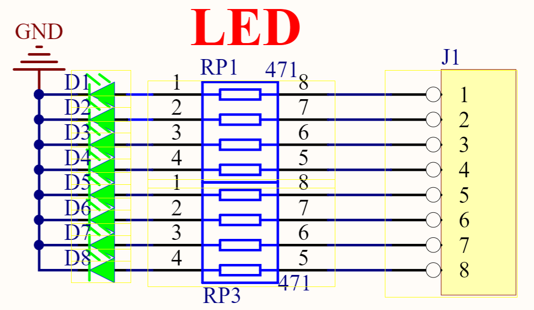 我们的开发板上有一组(8个)共阴的LED,对于共阴的LED,我们只需要在LED的阳极施加一个高电平就可以让LED灯点亮。所以,我们要想让LED D1灯点亮,根据硬件原理图,我们只要把J1的1PIN连接到ESP32的GPIO口,并置为高电平就好了。