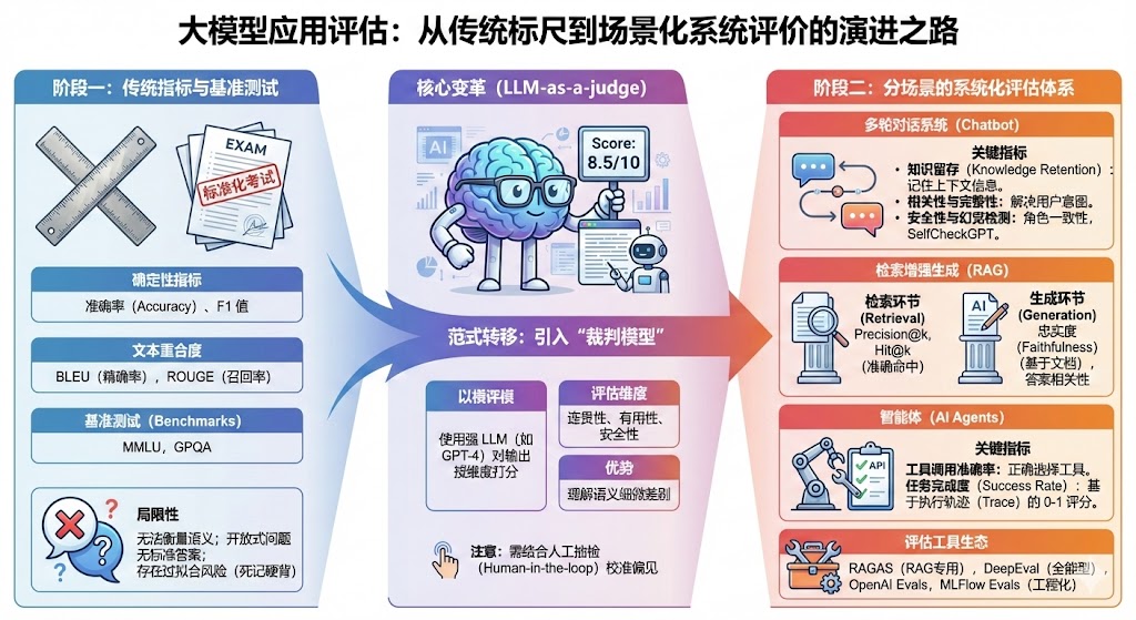 大模型应用的评估是一个持续迭代的过程。从 BLEU/ROUGE 等传统指标的"硬匹配",到 LLM-as-a-judge 的"软评分",再到针对 RAG 和 Agent 的场景化指标,评估体系正变得越来越精细。