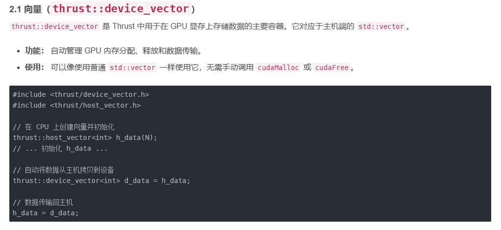 thrust::device_vector 是 Thrust 中用于在 GPU 显存上存储数据的主要容器。它对应于主机端的 std::vector。