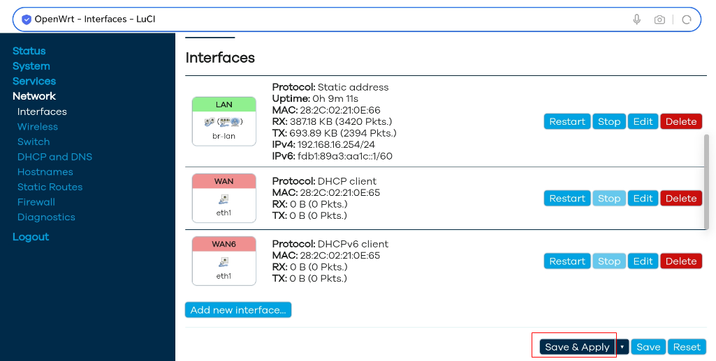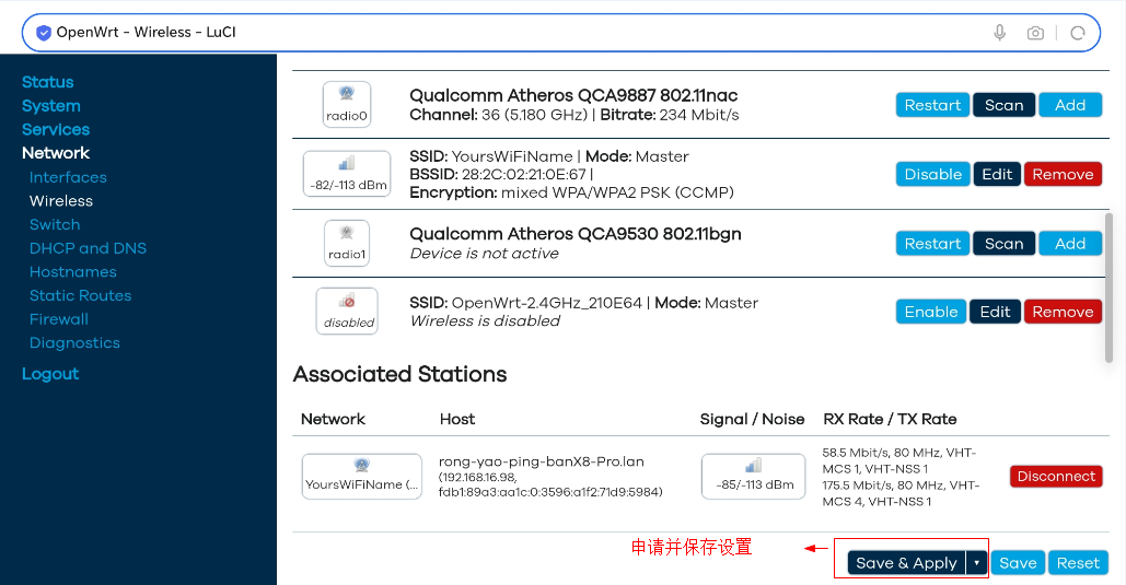 9、设置完成后,退出到主界面,必须点击Save&Apply申请保存,否则设置无效。