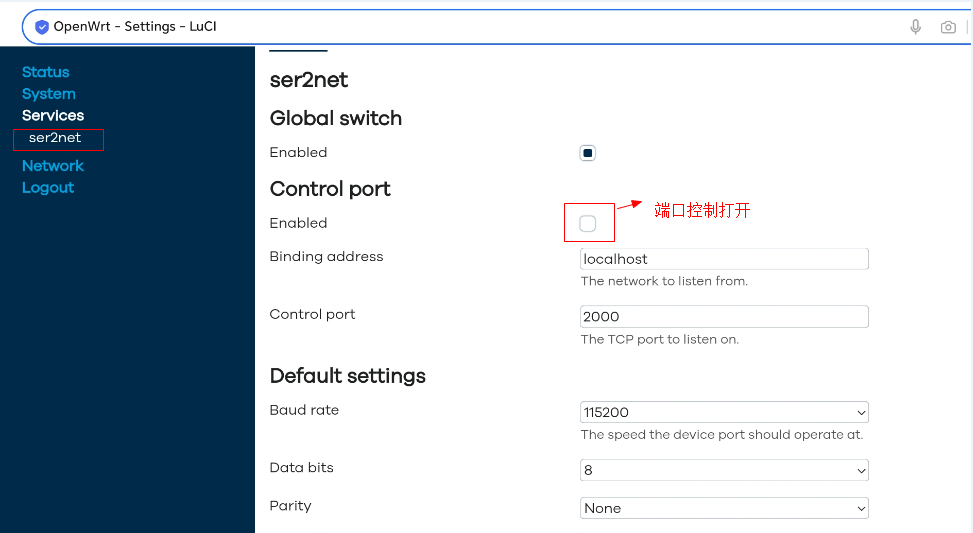 10、选择ser2net,打开控制端口。必须打开这个端口,否则数据无法传输。