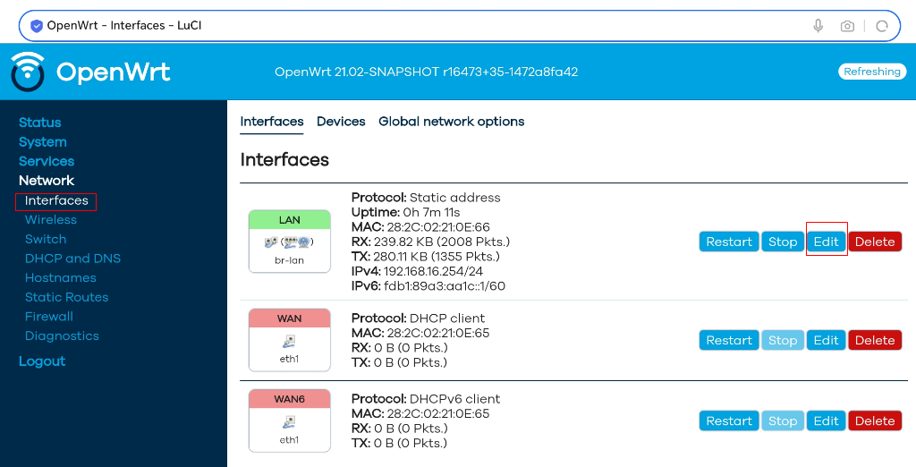 2、选择Interface->Edit,进入设置界面。
