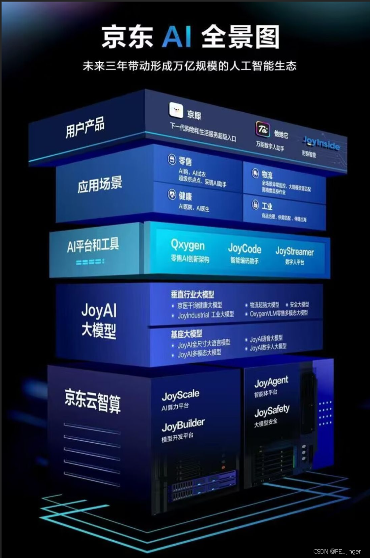 | 1. 基础设施 | 京东云智算 | JoyScale (AI算力平台) JoyBuilder (模型开发平台) | 提供底层算力、模型训练与开发工具,是整个AI体系的"发电厂"和"工作台"。 |