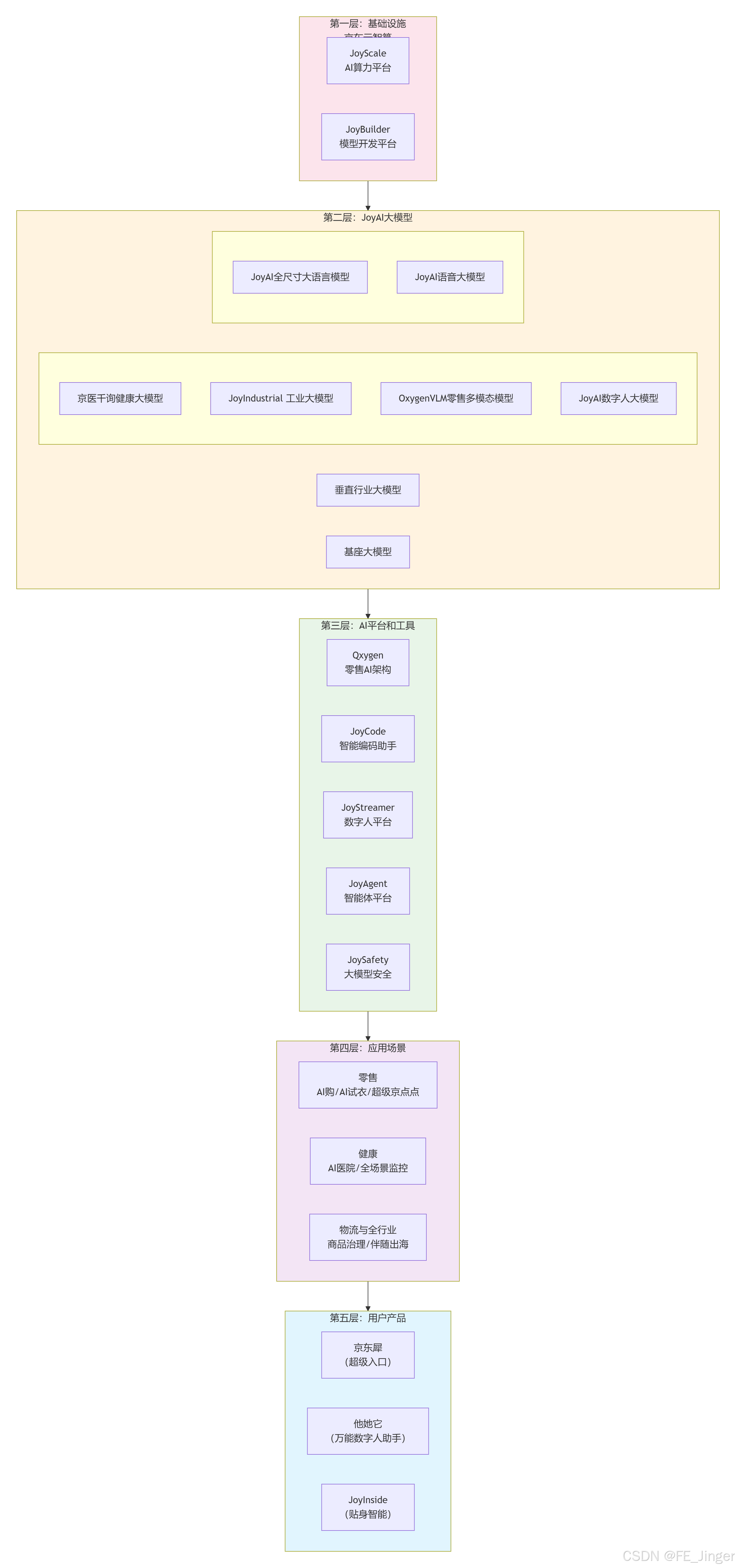 | 2. 模型层 | JoyAI大模型 | 基座大模型 (全尺寸大语言模型、语音大模型) 垂直行业大模型 (健康、工业、零售、数字人等) | 作为"AI大脑",提供通用的认知能力和面向特定行业的专业化智能。 |