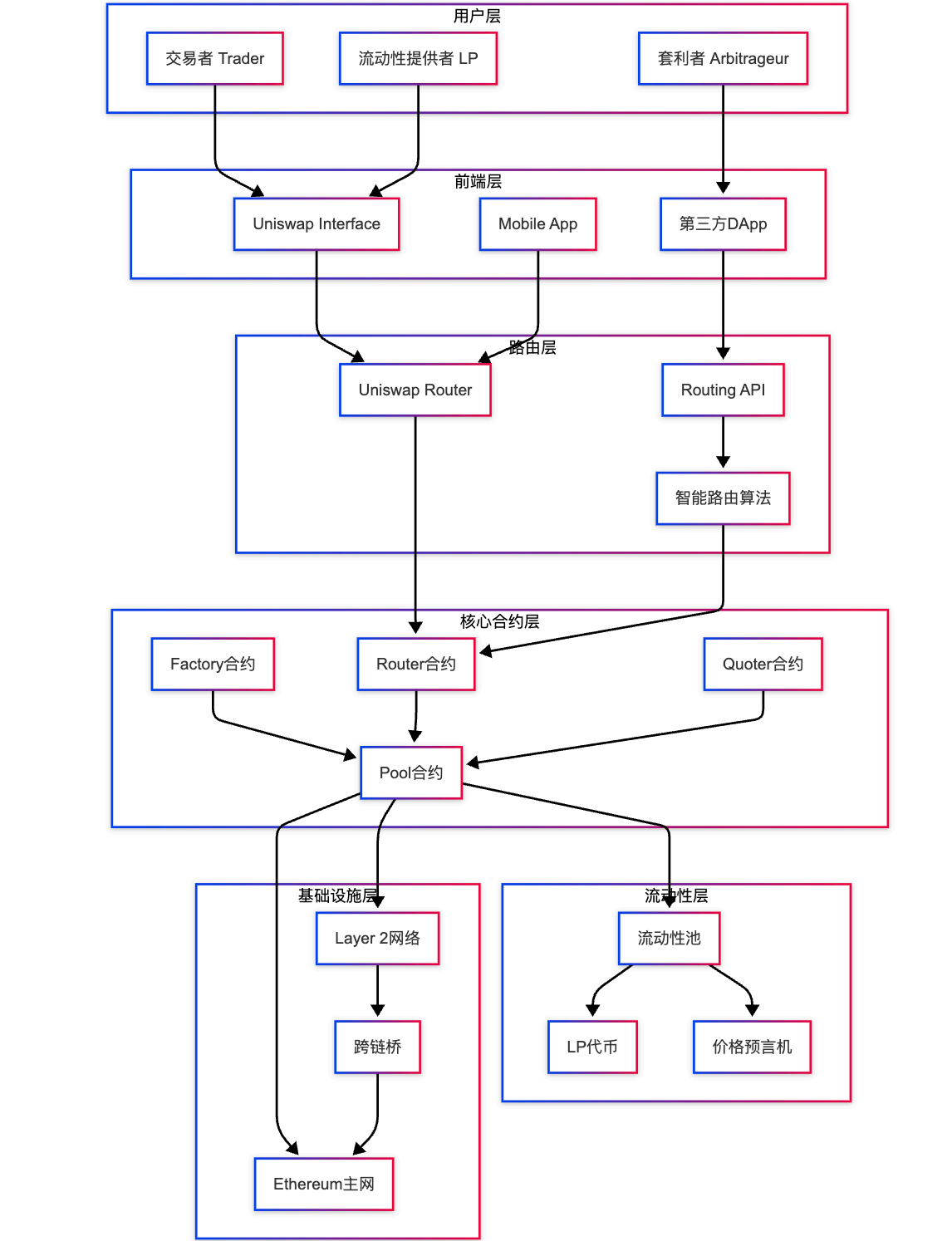 Uniswap的架构采⽤分层设计,从⽤户交互到区块链基础设施,每⼀层都有明确的职责。这种分层架构的优势在于: