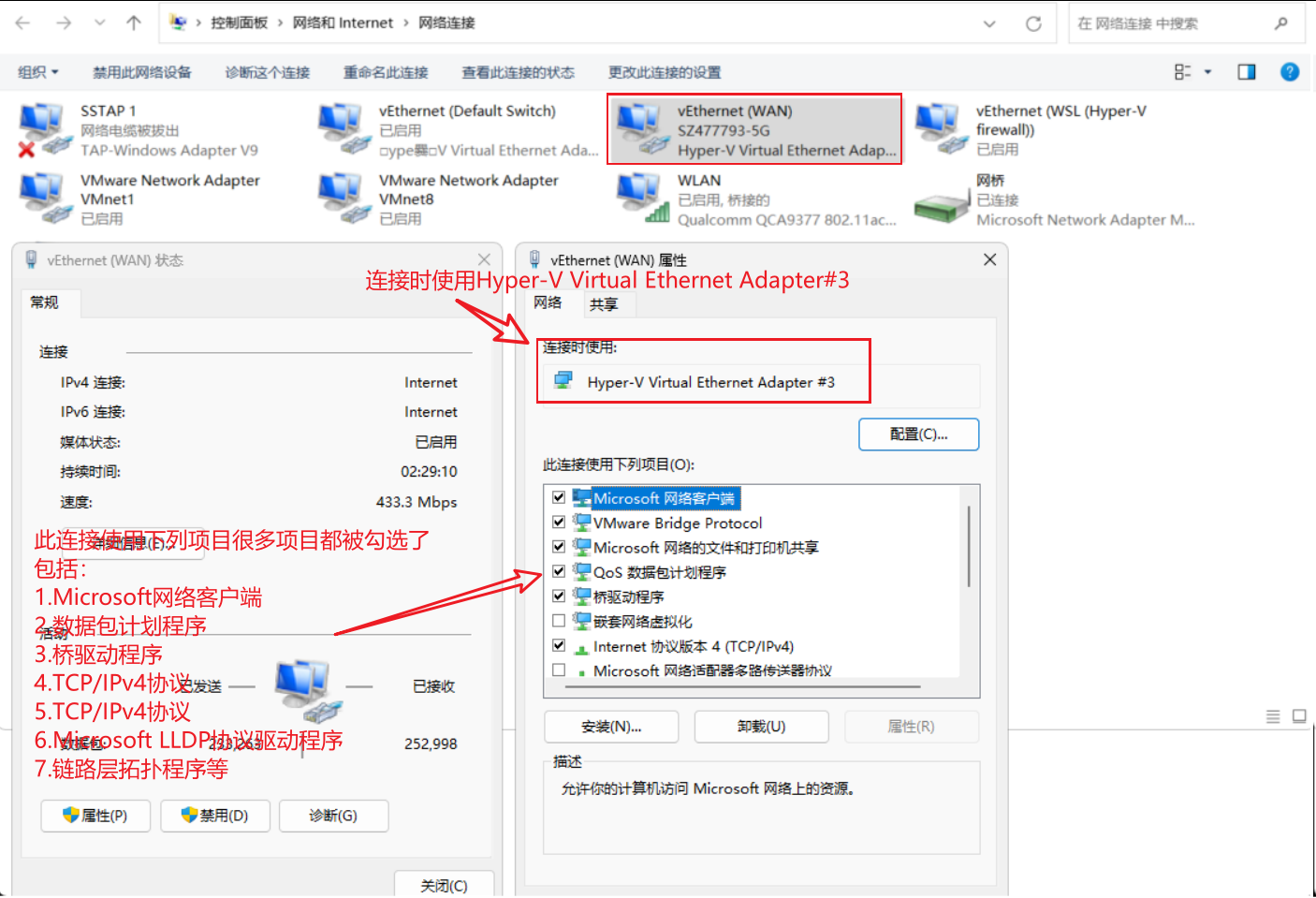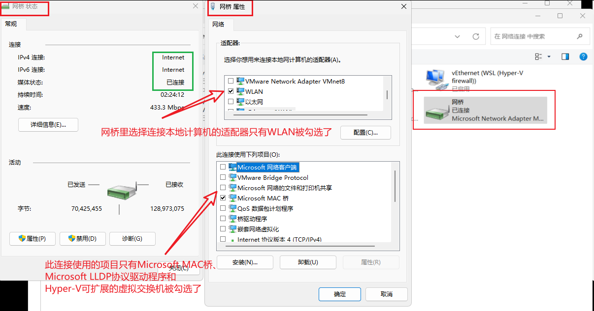 你可能会问:为什么网桥里不勾选 IPv4,而要到 vEthernet 里勾选?