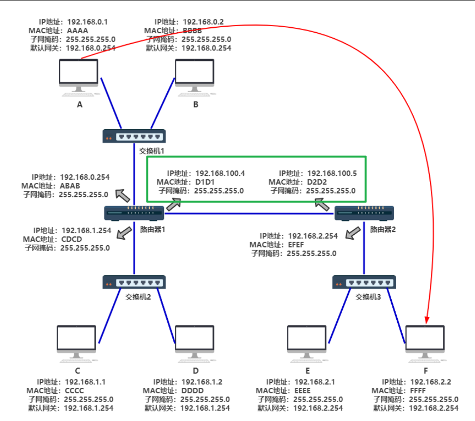 192.168.100.5,而不是192.168.100.4或者别的?这是因为"下一跳"必须是路由器 1 "直接能喊应"的人。