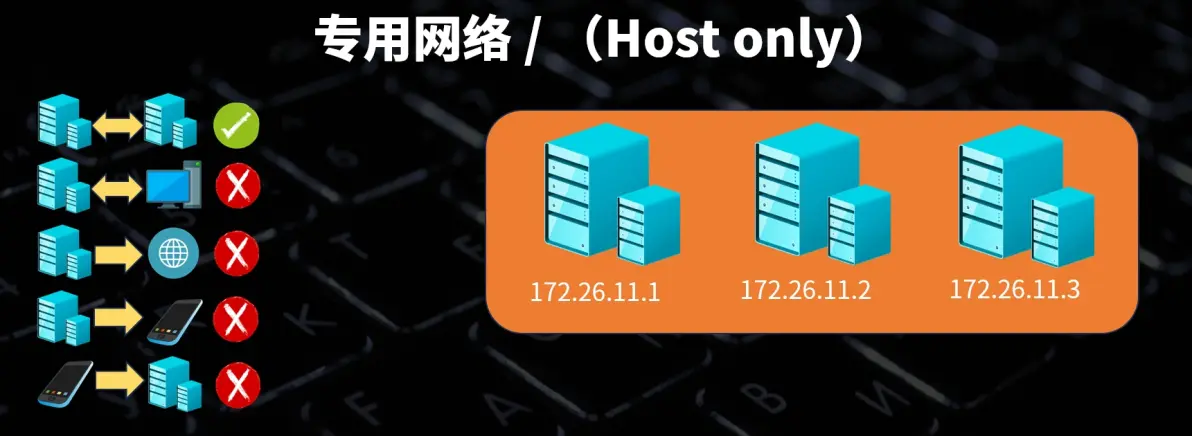 我们看第二种模式,专用网络 其他虚拟机称为Host only, 这种模式就更简单了,直接抹掉下面的所有内容,形成一个虚拟机的专用网络,只供虚拟机之间的连接,此种模式下切断了与宿主机的联系,当然也不能连接互联网。