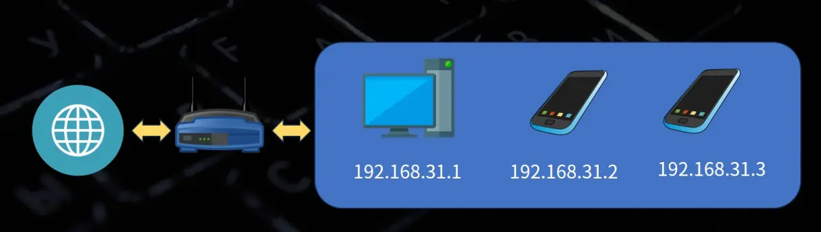 我们先看一个典型的家庭网络,路由器作为网关连接互联网,并且为局域网设备分配局域网IP地址,比如我的电脑分配了192.168.31.1,两个手机分配了192.168.31.2,192.168.31.3的局域网地址。