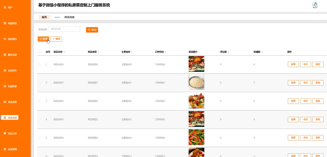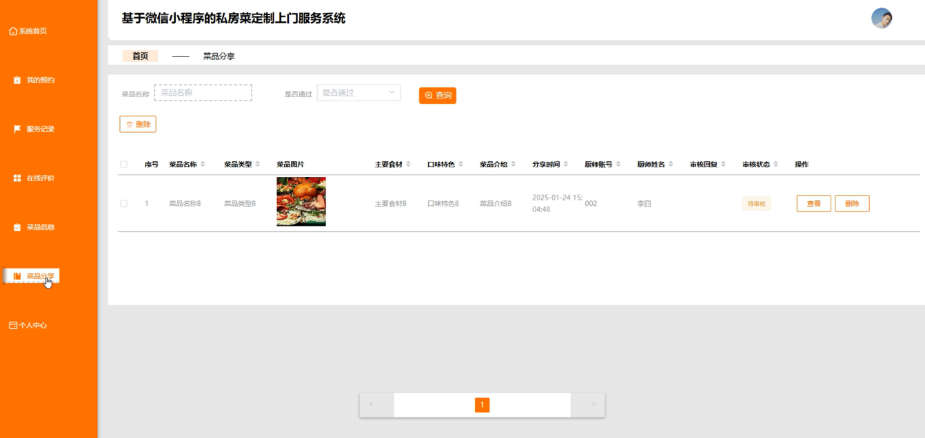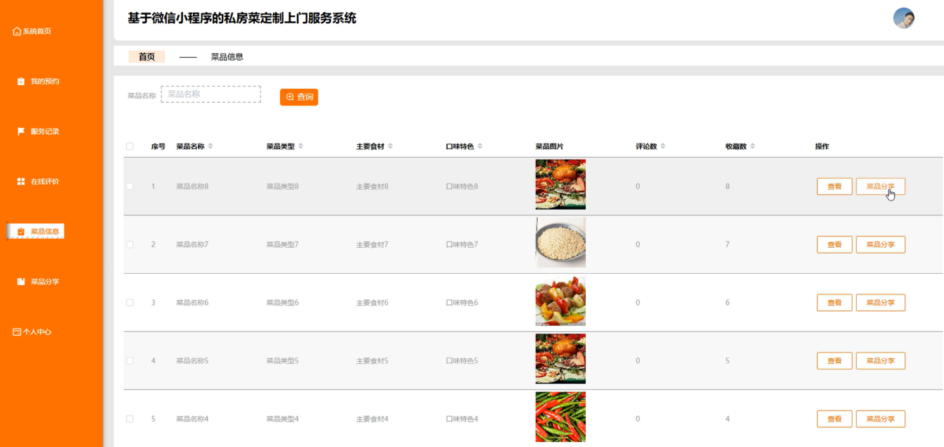 - 用户(食客)需求:搜索、筛选私厨及菜品;查看私厨详情(姓名、类型、费用等)与菜品详情(名称、食材、口味、图片等);收藏、点赞心仪菜品;在线预约私房菜上门服务;查看个人预约记录与服务历史;对服务及菜品进行在线评价;分享菜品。