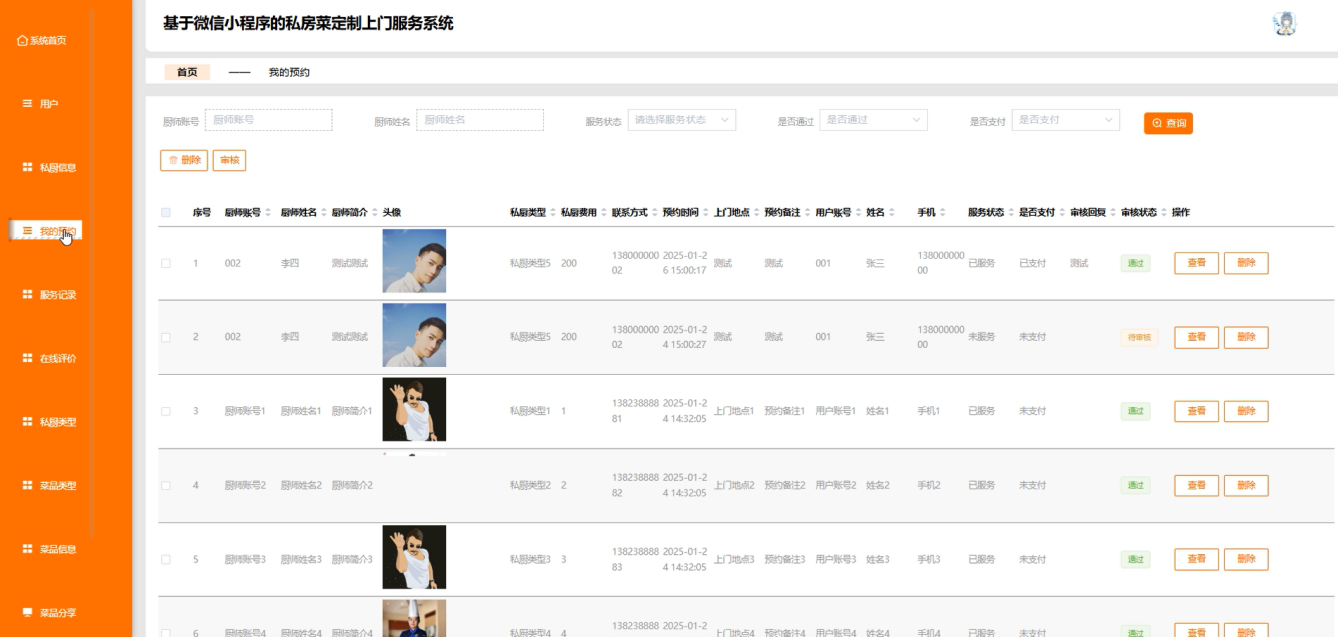 - 多角色协同管理:精准匹配管理员、用户、厨师三类角色需求,构建 "用户筛选 - 厨师响应 - 管理员监管" 的协同模式,实现服务规范化管理与个性化需求的平衡。