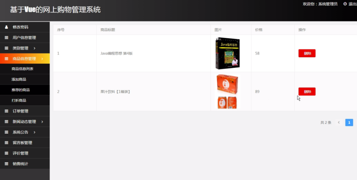 系统后台的商品信息管理对添加商品、推荐的商品以及打折商品这些详细信息今天统一管理。方便管理员对这些商品进行新增、修改或者是删除等操作。如下图所示: