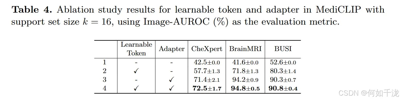 - 目的: 表4的目的是验证MediCLIP框架中两个关键组成部分------可学习标记(learnable token)和适配器(adapter)------的有效性和重要性。