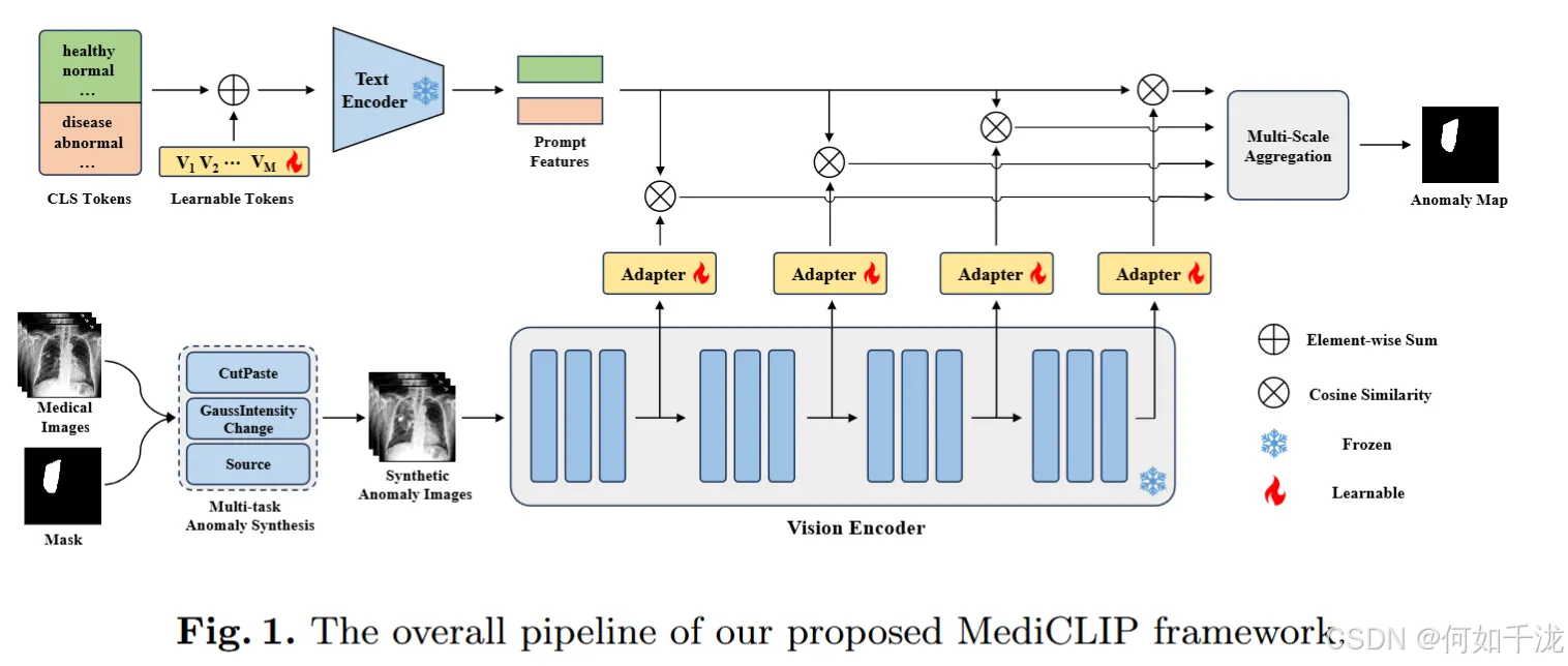 - 方法概述: MediCLIP通过自监督微调(self-supervised fine-tuning)的方式,将著名的CLIP模型(作为视觉-语言模型)适配到少样本医学图像异常检测任务中。