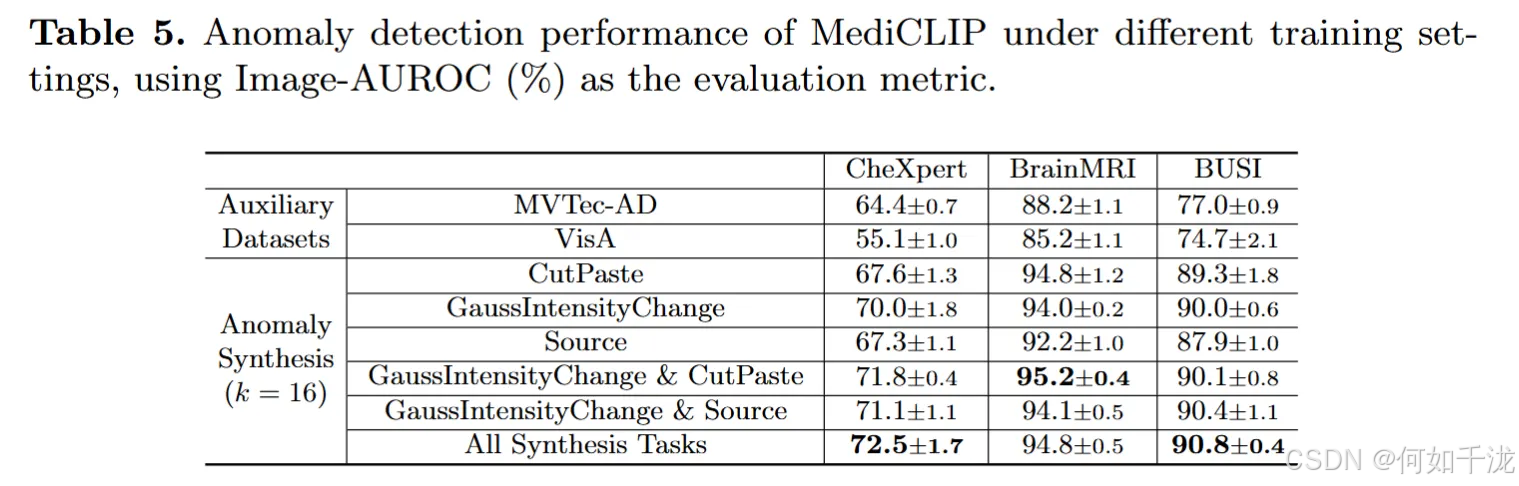 - 结论: 与使用这些辅助数据集相比,MediCLIP采用的医学异常合成任务 (medical anomaly synthesis task)取得了更好的泛化性能。这表明专门为医学领域设计的合成策略更适合此任务。