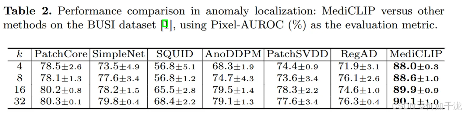 - 定位任务: 表2展示了MediCLIP与其他方法在BUSI数据集上的异常定位性能。