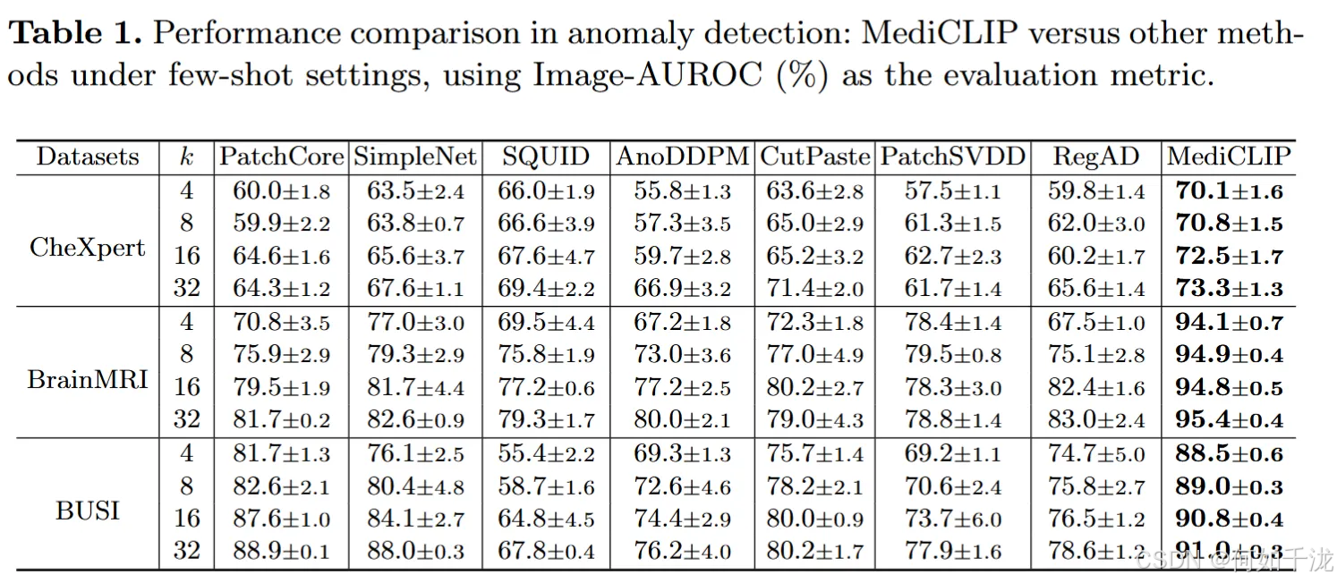 - 性能提升: 在少样本学习设置下,MediCLIP 相较于现有最先进的方法,性能提高了约 10%。