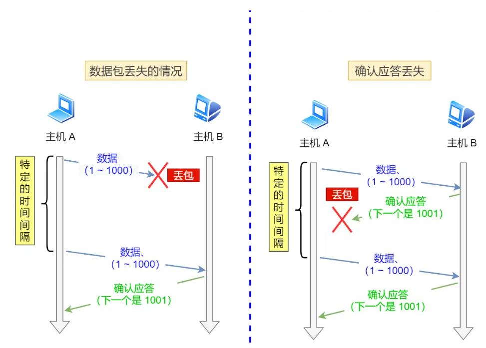 重传机制的其中一个方式就是在发送数据时,设定一个定时器,当超过指定的时间后,没有收到对方的ACK报文,就会重发该数据,也就是超时重传。