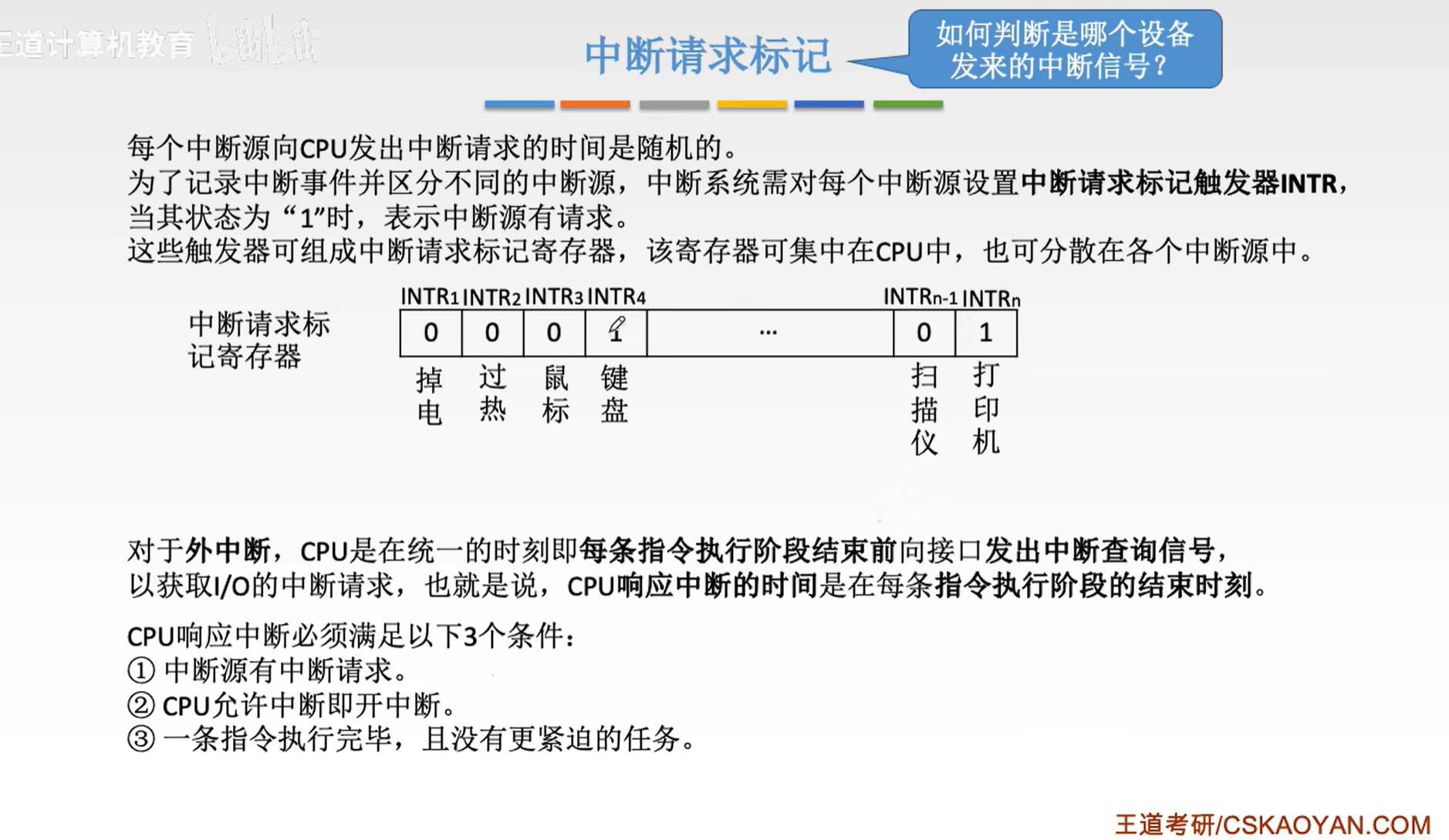 - CPU 执行完当前指令,无更紧急任务(如复位、异常)。满足条件后,CPU 进入中断响应阶段。