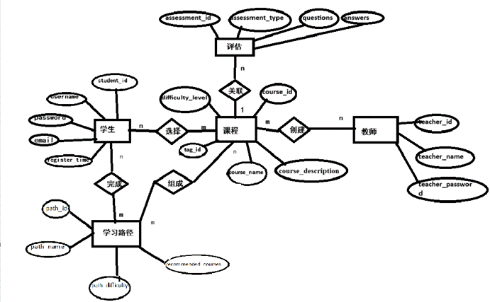 系统相关实体有:学生、教师、课程、学习路径、评估。