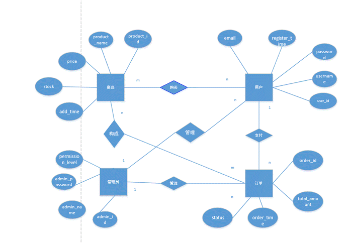 ②管理员属性:admin_id,admin_name, admin_password, permission_level。
