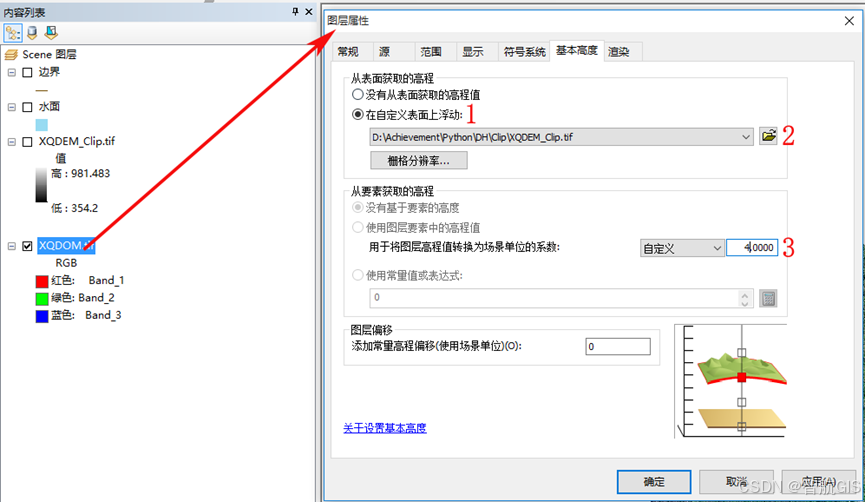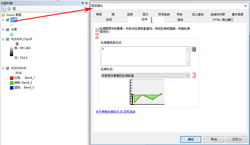 - 从要素获取的高程:自定义输入4,数越大三维效果越明显。