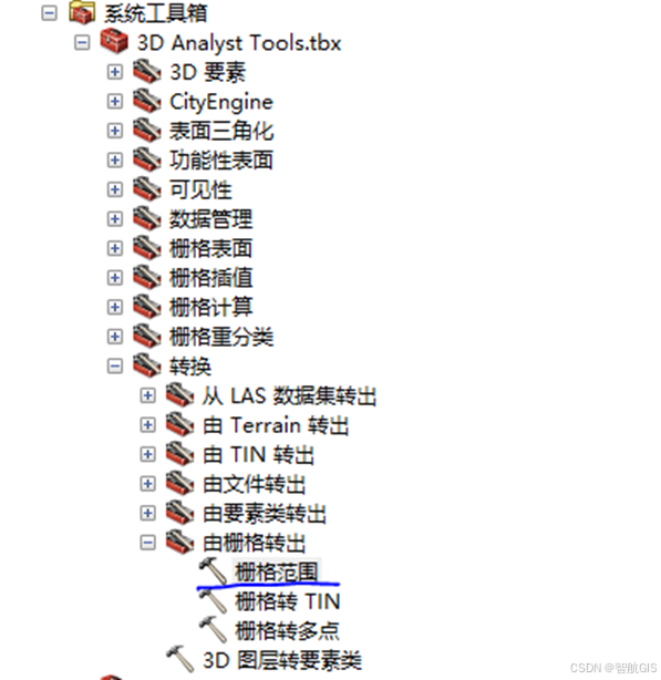 边界和水面可以使用【系统工具箱】>【3D Analyst Tools】>【转换】>【由栅格转出】>【栅格范围】工具获取。获取的边界和水面与DOM一致。