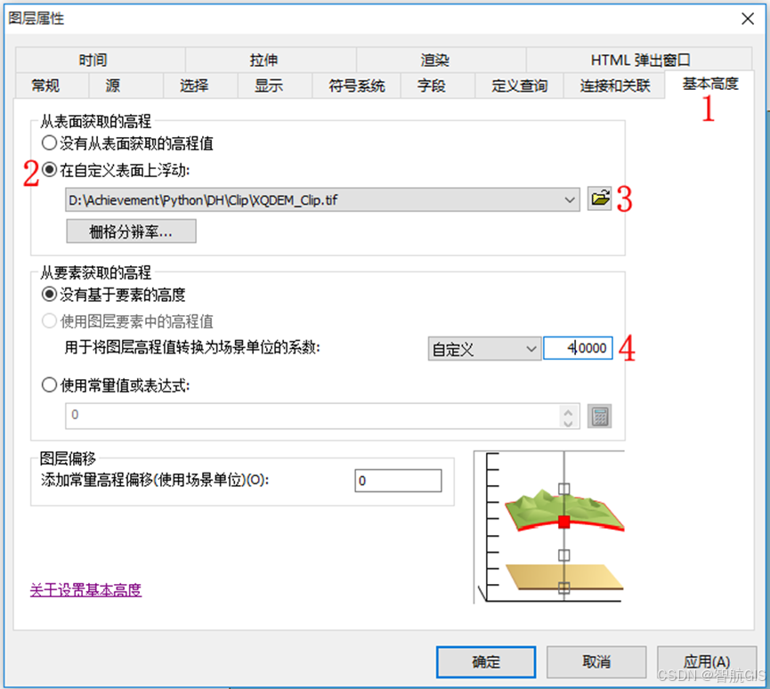 - 从表面获取的高程:在自定义的便面上浮动,选择准备的DEM