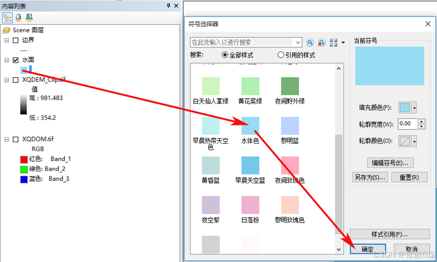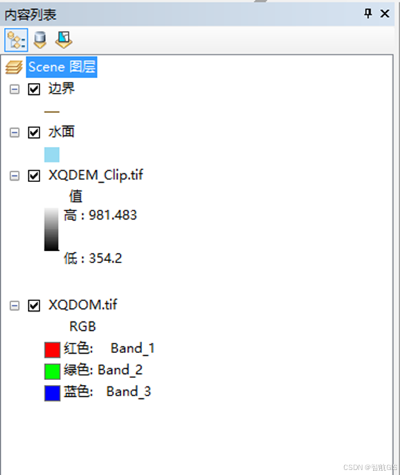 把需要用到的数据加入到ArcScene中,其中,如下图: