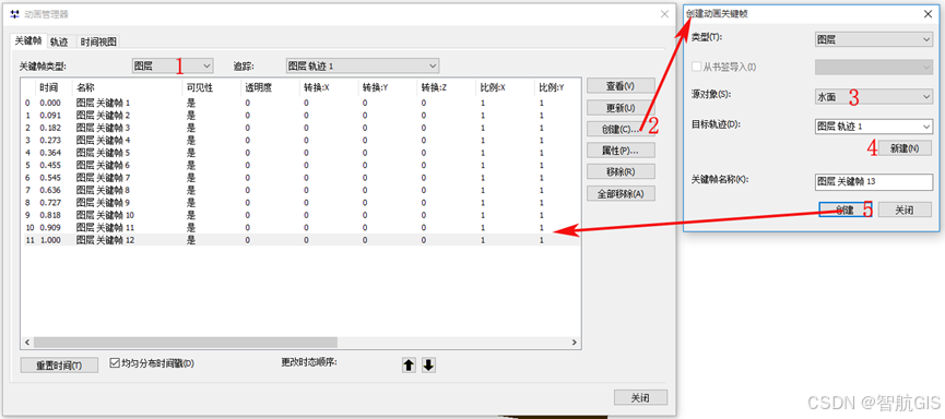 在动画管理器中,关键帧类型:图层,然后点击创建,在弹出的创建动画关键帧中,源对象选择水面,点击新建---创建,连续创建12个关键帧。