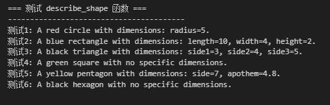 任务:编写一个名为describe_shape的函数,该函数接收图形的名称shape_name(必需),一个可选的color(默认"black"),以及任意数量的描述该图形尺寸的关键字参数(例如radius=5对于圆,length=10,width=4对于矩形.)