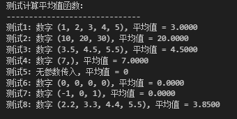 print(f"测试{i}: 数字 {numbers}, 平均值 = {result:.4f}")