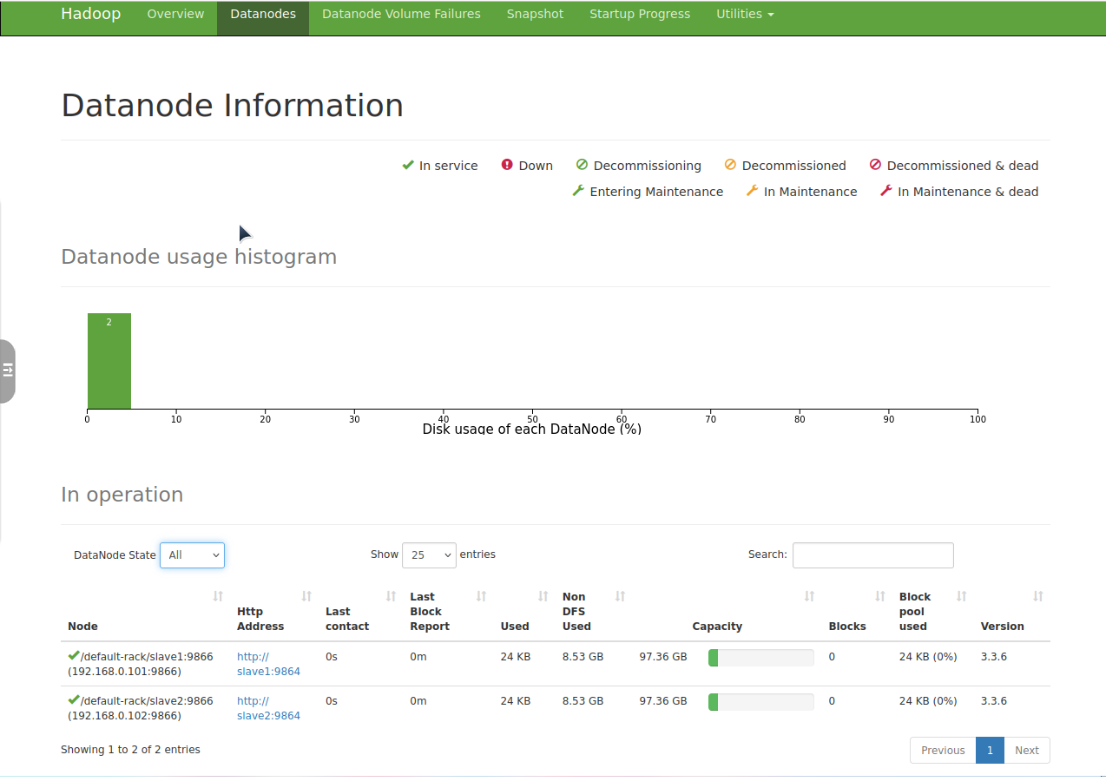 - 左侧「Datanodes」:显示slave1、slave2两个节点(状态为In Service)