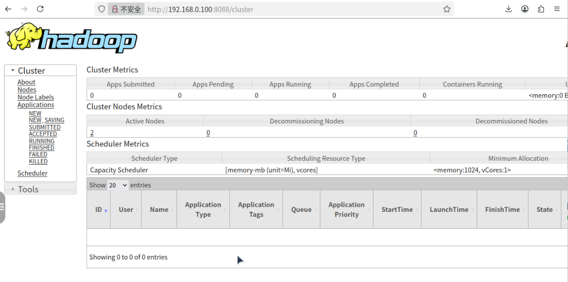 | master | [192.168.0.100](192.168.0.100) | 主节点(NameNode+RM) | NameNode、ResourceManager |