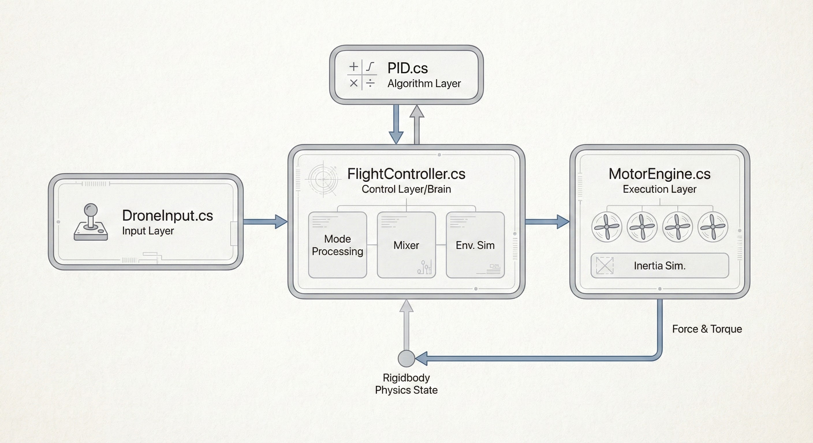 大脑 (Brain) | 1. 模式处理 :根据 Angle/Acro 模式将输入转为目标角速度。 2. PID 调度 :调用 PID.cs 计算误差。 3. 混控 (Mixer) :混合主油门与 PID 修正值。 4. 环境模拟:计算非线性阻力与地面效应。 |